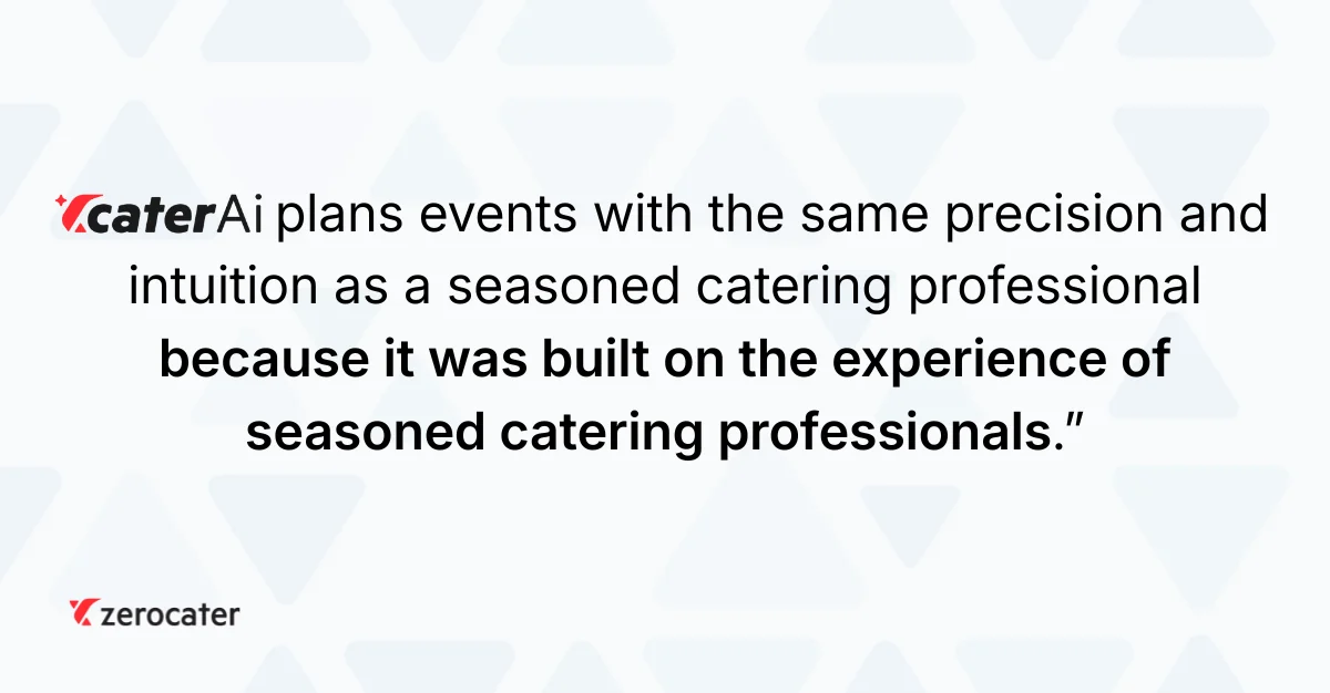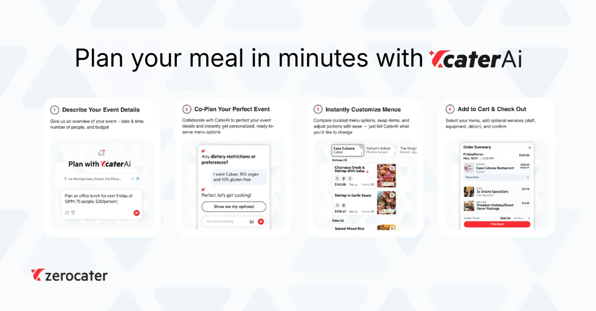 Zerocater has been working to change that, rebuilding the backbone of corporate catering by integrating technology and data into the process. In one chat, CaterAi manages menus, multiple dietary groups, budgets, staffing, equipment, and décor. Instead of coordinating across multiple vendors and tools, CaterAi serves as the single point of contact for all event planning needs. What once required multiple tools now takes one conversation.